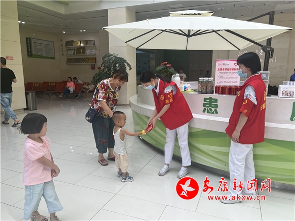 便民舉措送清涼。為更好地服務就醫群眾,醫院開展志愿者服務活動,為服務對象提供遮陽、送清涼、門診延伸、道路引導、就診咨詢等志愿服務。在門診大廳為前來就診的患者及陪同人員免費提供降溫飲品。該院的相關負責人說:“天氣炎熱,患者和家屬遠路趕來,容易產生急躁情緒,我們更應該把服務做得精細一些,有利于醫患溝通,也有利于為患者更好地服務。當我們把飲品送到患者及家屬手中時,不僅捎去了夏日的清涼,還幫助其緩解焦慮的心情”。