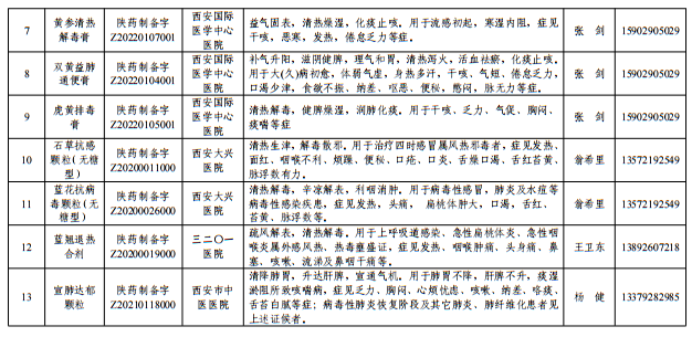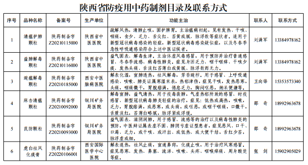 一是全市具有相關(guān)調(diào)劑品種使用需求且符合資質(zhì)的醫(yī)療機(jī)構(gòu)均可從《陜西省防疫用中藥制劑目錄及聯(lián)系方式》(詳見附件)中的醫(yī)療機(jī)構(gòu)購進(jìn)目錄中的13種制劑產(chǎn)品,調(diào)劑使用時間從發(fā)文之日起至 2023年6月30日。