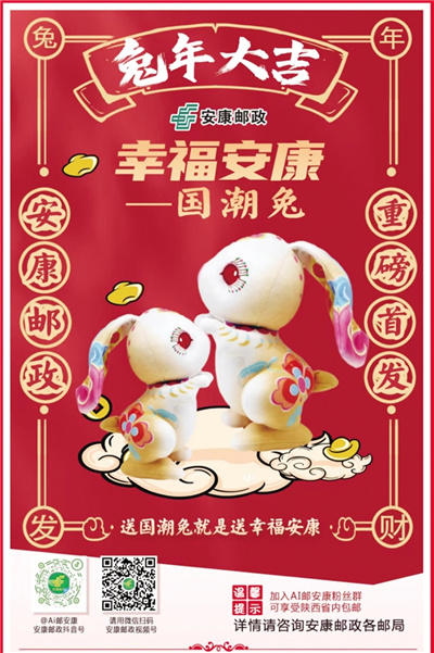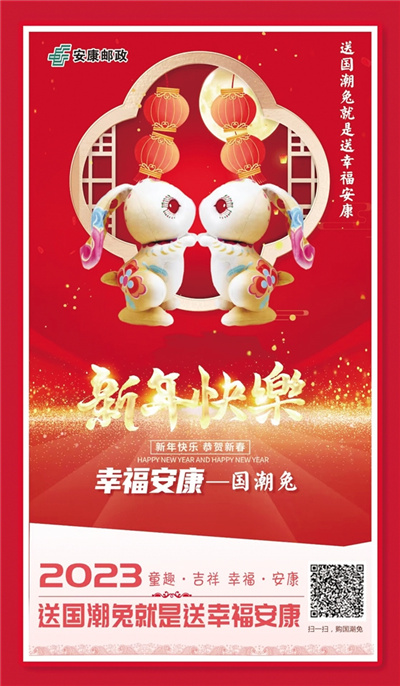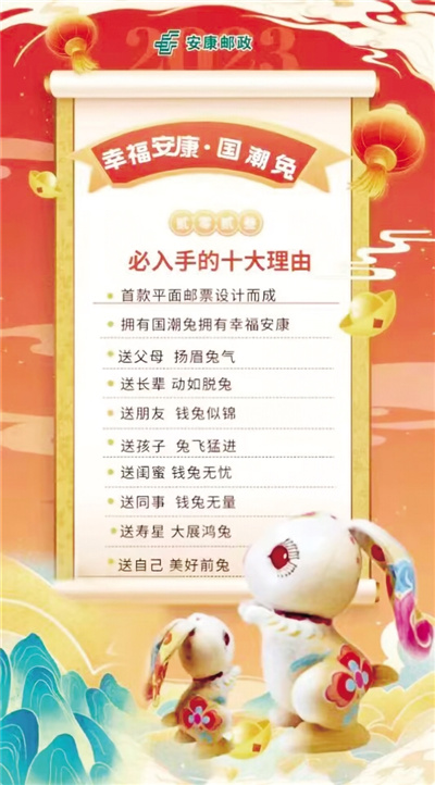 安康毛絨玩具產業自2017年以來成為全國脫貧攻堅的典范,現已成為全國第四大毛絨玩具生產基地。在2023癸卯年到來之際,為有效將中國集郵文化與安康毛絨玩具產業發展相結合,將文化資源轉化為能看得見、摸得著的文化創意產品,促進安康毛絨玩具產業振興,安康市郵政分公司聯合恒口毛絨玩具五大運營中心,結合生肖郵票文化資源, 以“有型、有情、有意”為理念,在全國首創開發了“幸福安康·國潮兔”毛絨潮玩。