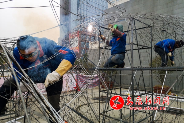1月15日,工人們在西城閣制作新春主題燈飾。據現場負責人介紹,他們將會制作12組戶外燈飾,分別安裝在漢江一橋、三橋、水西門、金州廣場等地,扮靚一江兩岸。(潘……