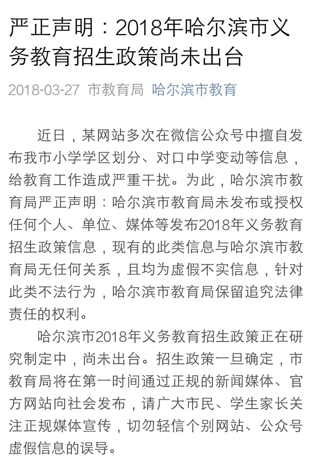 官方聲明表示,近日,某網站多次在微信公眾號中擅自發布我市小學學區劃分、對口中學變動等信息,給教育工作造成嚴重干擾。為此,哈爾濱市教育局嚴正聲明:哈爾濱市教育局未發布或授權任何個人、單位、媒體等發布2018年義務教育招生政策信息,現有的此類信息與哈爾濱市教育局無任何關系,且均為虛假不實信息,針對此類不法行為,哈爾濱市教育局保留追究法律責任的權利。