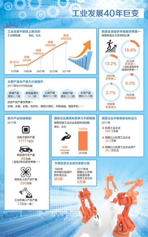 1978年1622億元,1992年突破1萬億元,2007年突破10萬億元,2012年突破20萬億元,2017年接近28萬億元……這條持續(xù)躍升的曲線,就是改革開放40年來中國(guó)工業(yè)增加值的增長(zhǎng)軌跡。