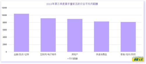 從2018年第三季度需求量前五的行業平均月薪看,金融/投資/證券行業月薪最高,為10389元;ヂ摼W及房地產行業需求量持續升溫,但平均薪酬稍低于金融/投資/證券行業。快消行業以8259元的平均薪酬排名第四,教育/培訓/院校行業以8133元的平均薪酬排名最末。