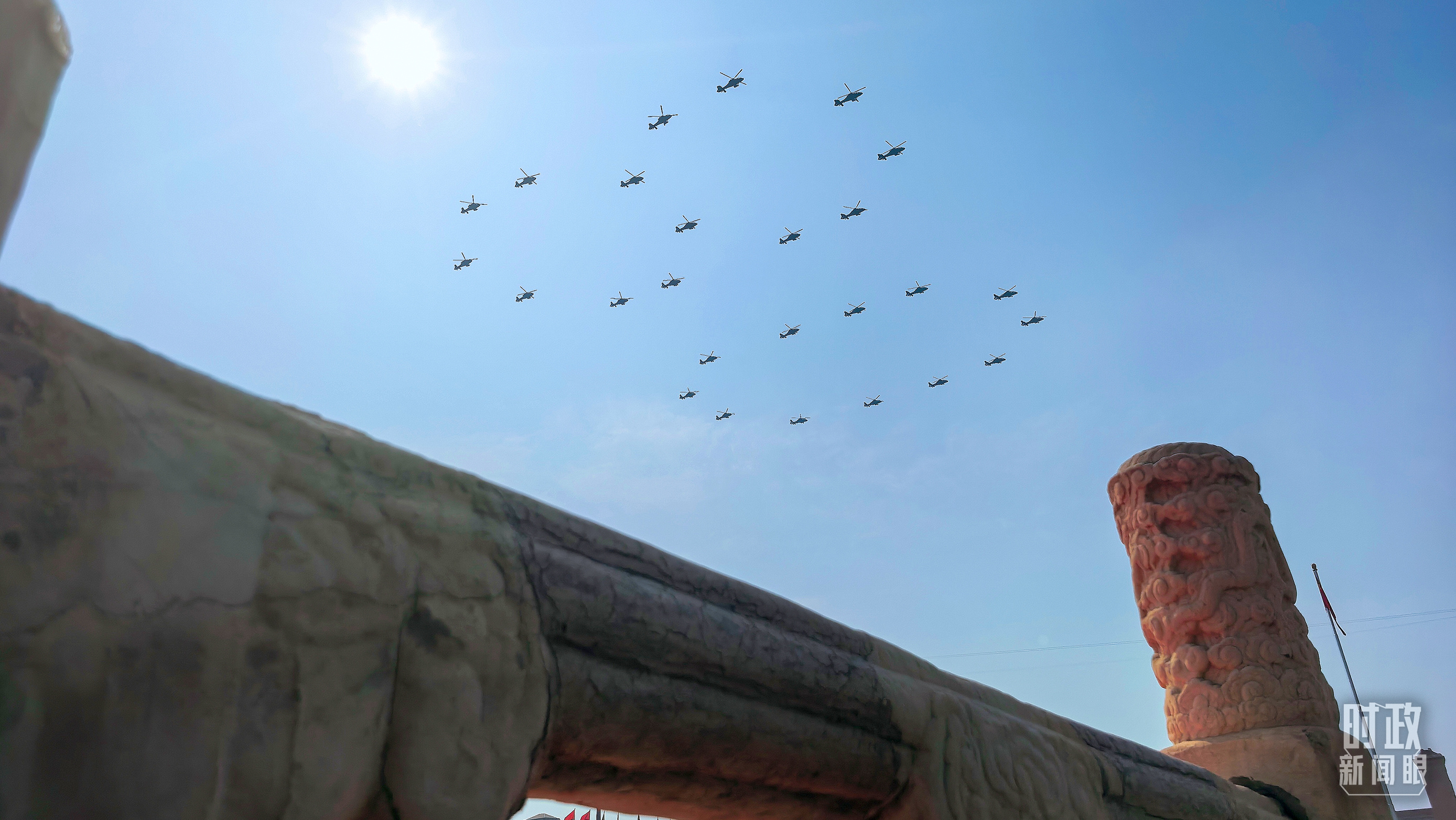 空中護旗梯隊率先亮相分列式環節,26架直升機組成巨大的“80”字樣。教練機梯隊拉出14道彩煙,向中華民族14年可歌可泣的抗戰歷程致敬,向14億多中國人民奔向強國復興的不懈奮斗致敬。