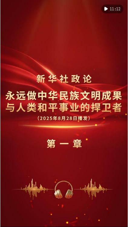 新華社8月28日播發《新華社政論|永遠做中華民族文明成果與人類和平事業的捍衛者——寫在中國人民抗日戰爭暨世界反法西斯戰爭勝利80周年之際》。我們邀請誦讀嘉賓任志宏演播“第一章”。aLH安康新聞網