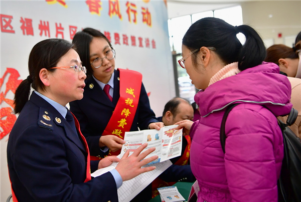 國家稅務總局福州經濟技術開發區稅務局工作人員,在馬尾區“減稅降費 春風行動”宣講活動現場為一家企業的出納(右一)講解稅收優惠政策(2月25日攝)。 新華社……