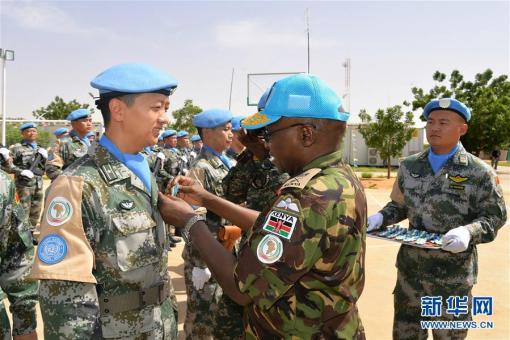 7月15日,在蘇丹達爾富爾法希爾,聯合國和非洲聯盟駐達爾富爾聯合特派團(聯非達團)部隊司令恩貢迪中將(右二)把勛章佩戴在中國維和官兵胸前。中國首支維和直……