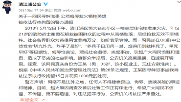 公然侮辱救火犧牲消防戰士 一網民被拘15日罰款1000元