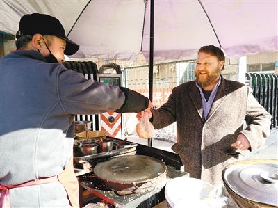 每天上午,只要有時間,他都會準時來到西安外國語大學雁塔校區北門外,買一份煎餅果子當早餐。煎餅攤的張老板和他是“老熟人”了。“我的中文全是在飯館點餐時練習出來的,比如‘泡饃’‘biangbiang面’‘肉夾饃’,全是我的最愛!奔s翰開玩笑地說,西安人的學習熱情很高,知道他來自美國后,通常會跟他練習英語口語,沒人找他聊中文。因此,他的中文水平至今也沒能提高多少!拔业母改浮⑴笥褋砦靼矔r,我可是他們的美食導游。哪家羊肉泡饃好吃,我都清楚!奔s翰笑稱自己已經養成了“陜西胃”,特別愛吃西安的各類美食。