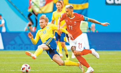 當地時間7月3日,瑞典隊球員福斯貝里(前左)和瑞士隊球員貝赫拉米(前右)在比賽中拼搶。58A安康新聞網