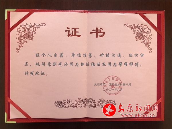 9月初,漢陰鄉村振興工作領導小組要求明確全縣派駐的第一書記和駐村隊員實行“師傅幫帶”,接到通知后我心里竊喜,打定主意一定要“拜”軍壩村黨總支劉光興同志為師傅。然而在我走到劉總支面前提及此事時,平時和藹可親的總支瞬間變得深沉嚴肅起來,沉默了幾秒后強調要報請上級部門批準才答應。這個舉動著實讓我犯嘀咕甚至還有點失望,內心想著是不是劉總支不想帶我或者看不上我這個徒弟?按照縣上統一安排,很快就組織了“師傅幫帶”集中培訓,發放證書,并對師傅和徒弟分別提出考核獎懲 。看似此事順理成章,我在工作中叫總支,生活中叫師傅,沒有一點違和感。