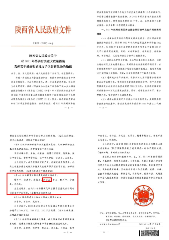 從陜西省人民政府文件《陜西省人民政府關于對2021年落實有關重大政策措施真抓實干成效明顯地方予以督查激勵的通報》(陜政字[2022]69號)獲悉,漢陰縣獲評2021年度職業教育改革發展成效明顯縣。此次全省共六個縣區榮獲職業教育改革發展成效明顯縣,漢陰縣名列其中。陜西省教育廳將在2023年安排現代職業教育質量提升計劃專項資金時對漢陰縣予以傾斜。