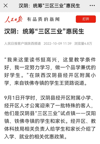 2022年7月,漢陰縣制定出臺了《統(tǒng)籌“三區(qū)三業(yè)”推進教育優(yōu)質(zhì)均衡發(fā)展試點方案》,探索推行學(xué)區(qū)園區(qū)社區(qū)聯(lián)動工作機制,全力實現(xiàn)保障學(xué)生學(xué)業(yè)、家長安心就業(yè)、家庭安居樂業(yè)(簡稱“三區(qū)三業(yè)”),保障民生需求,促進全縣教育、就業(yè)、安居高質(zhì)量發(fā)展。該試點方案明確了加強學(xué)區(qū)、園區(qū)、社區(qū)建設(shè)的9條措施。