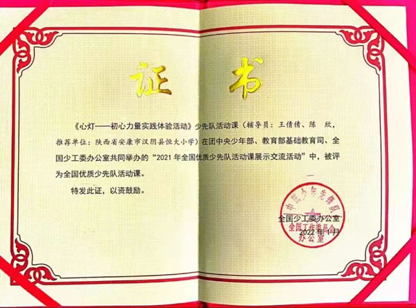 本網訊(通訊員 林愛銘)近日,共青團中央少年部、教育部基礎教育司、全國少工委辦公室公布“2021年全國優質少先隊活動課”名單。漢陰縣恒大小學選送的少先隊活動……