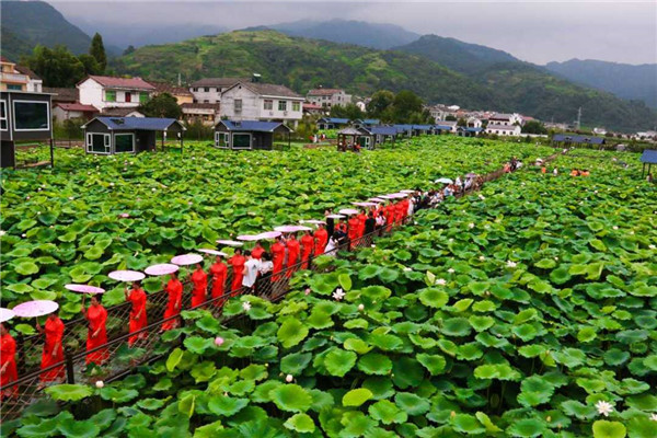 在石泉縣池河鎮(zhèn)五愛村,群眾正在進行荷田旗袍秀。龔仕建攝