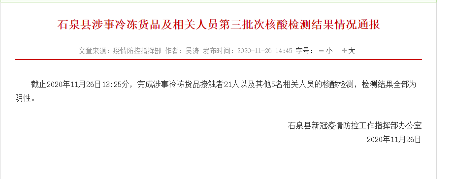 截止2020年11月26日13:25分,完成涉事冷凍貨品接觸者21人以及其他5名相關人員的核酸檢測,檢測結果全部為陰性。Pyy安康新聞網