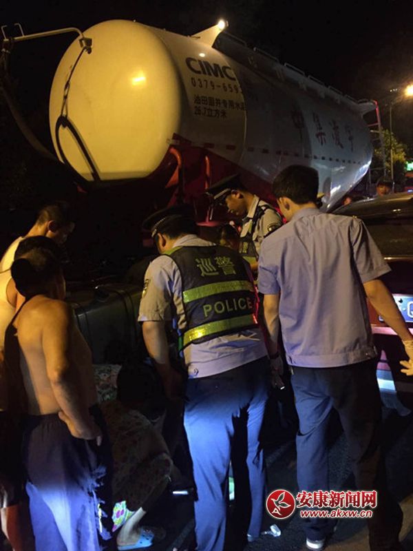 7月21日晚23時許,旬陽縣公安局巡警大隊康華園巡邏民警接到過路的群眾報警,稱:城區周家溝附近有交通事故,可能有人受傷。民警立即趕往事發地點,沿途發現交通以堵塞,長長的車隊一眼望不到頭,趕到事發地點后,發現一油罐車車底躺著兩個人,一男一女系夫妻關系,女子的腿部受傷嚴重,不能移動,當民警趕到現場后,交警以及救護車隨后趕到,巡邏民警配合救護人員將躺在油罐車下的兩人救出,及時送往醫院救治。