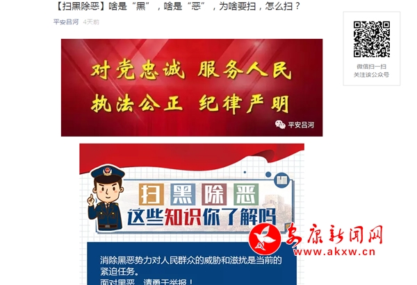 群眾“分段式”宣傳。根據轄區群眾各年齡段情況采取讓該年齡段人群容易接受的宣傳方式。對于年齡在20歲至45歲之間的年輕群體,依托各村警務群、“平安呂河”微信公眾平臺和“呂河警務聯動平臺”微信朋友圈等新媒體不斷推送“掃黑除惡”專項斗爭法律知識。對于年齡在45歲以上的人群,專門開通了短信平臺,實行“點對點”宣傳,形成了宣傳“全覆蓋”。