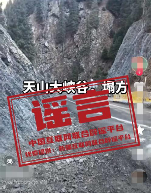 真相:近日,有網民在網絡平臺發布視頻并配文稱“天山大峽谷塌方”,引發關注。經烏魯木齊市南山景區管理委員會核實,該情況不屬實,相關信息系謠言。網傳圖片實為2025年10月24日,烏魯木齊中佳勘察設計有限公司在天山大峽谷景區進入山溝1.3公里處進行山體排險作業時的畫面。(來源:“新疆網絡辟謠”微信公眾號)