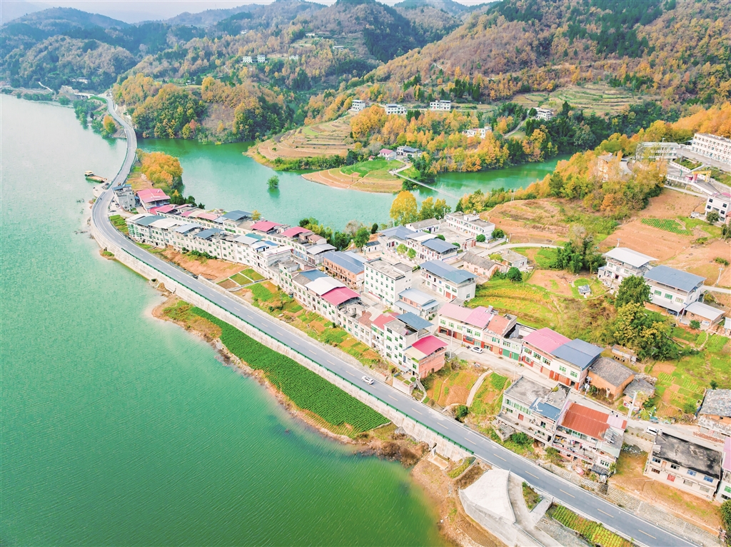 夕陽下的沙坪河,斑斕山林與澄澈水色繪就成一幅靈動的水鄉畫卷。郭浩 攝